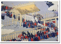 遷御の年からさかのぼること8年(平成18年、19年)2年つづきの「お木曳き」の祭のルーツは、用材を神宮へと運搬する神領民の奉仕作業。20年に1度の祭とあって、ここぞ神領民の出番とばかり、威勢のよい木遣歌に合わせて伊勢の町に町内自慢のお木曳き車が曳きこまれます。